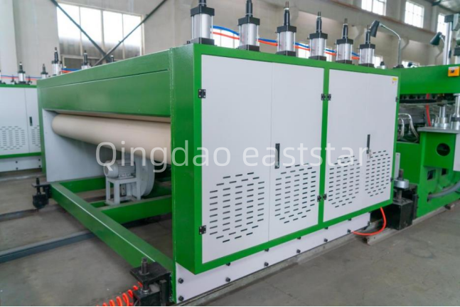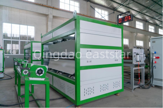 celýVybavenie panelov PP s otvorenými bunkamizahŕňa aj advojpolohový hydraulický menič obrazoviek, anivelačná peca amocnýzariadenie na chladenie vzduchom. Prvý ťažný stroj je vybavený 6 pármi 12 gumových valcov, každý s veľkosťou valcovej plochy ¢250x2300 mm, poháňaných motorom s výkonom 7,5 kW. Vyrovnávacia pec má rozsah regulácie teploty 40℃-150℃, rozdelený do 16 zón, aby sa zabezpečila rovinnosť dosiek. TheVýrobná linka na výrobu dutých dosiek PPje tiež vybavená priečnym rezacím strojom a stohovacou plošinou na dosiahnutie automatizovanej výroby.