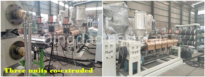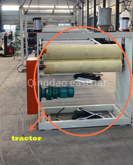 celýviacvrstvová výrobná linka na koextrúziuobsahuje aj dva hydraulické meniča sita, 8-metrovú chladiacu podporu a trakčný rezací systém. Menič sita využíva taiwanské hydraulické komponenty, ktoré umožňujú výmenu sita bez zastavenia stroja. Trakčný stroj je vybavený valčekmi z nitrilovej gumy Φ240×2500 mm poháňanými motorom s výkonom 2,2 kW, čím sa dosahuje synchrónna regulácia otáčok s tromi valcami. Elektrický riadiaci systém zariadenia na koextrúziu plechov ABS využíva PLC a dotykovú obrazovku Siemens série S7 v kombinácii s frekvenčným meničom ABB na zabezpečenie koordinovanej prevádzky celej linky.