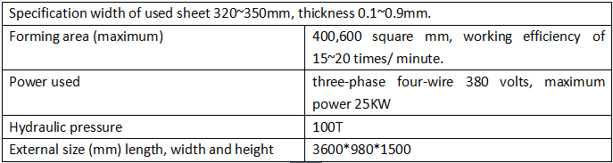 Technické parametre sejačky do škôlky Špecifikácia šírka použitého plechu: 300~320mm, hrúbka: 0,8~2mm. Tvarovacia plocha (maximum): 400 x 600 mm, pracovná účinnosť 15 ~ 20 krát / minútu. Použitý výkon: trojfázový štvorvodičový 380 voltov, maximálny výkon 25KW Hydraulický tlak: 100T Vonkajší rozmer (mm) dĺžka, šírka a výška) 3600mm*980mm*1500mm