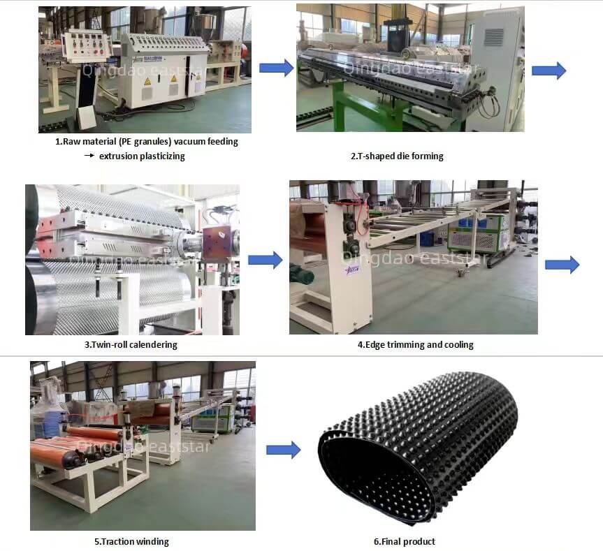 Qingdao Eaststar, využívajúc svoje hlboké technické znalosti v oblasti extrúzie so širokou šírkou, spustil vysoko výkonnú linku na výrobu PE drenážnych dosiek. Táto linka, navrhnutá špeciálne pre budovanie infraštruktúry, podzemné inžinierstvo a terénne úpravy, využíva jednozávitovkový extrudér s veľkým priemerom 105/33 a technológiu presného dvojvalcového formovania, aby sa zabezpečila rovnomerná štruktúra listu a efektívne odvodnenie. With robust plastic sheet production line manufacturing processes and top-tier electrical components from Siemens and ABB, we help customers enhance their production competitiveness and ensure a stable supply of engineering materials.