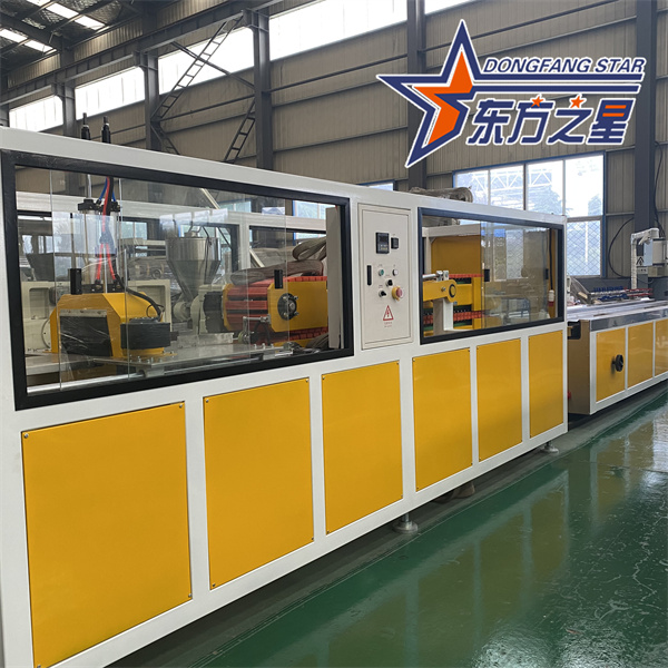 Vybavenie dosky Great Wall z PVC drevo-plastového kompozitu Linka na výrobu profilov využíva kónické dvojzávitovkové extrudéry série SJSZ-65/132, nerezové vákuové tvarovacie plošiny, pásové traktory, automatické rezacie integrované stroje a preklápacie vykladacie regály. Tvarovacia plošina je vybavená vysokotlakovou vákuovou pumpou a vodnou pumpou, ktoré sú štvorrozmerne nastaviteľné. Traktor je pneumaticky upínaný. Automatický rezací stroj s pevnou dĺžkou používa prepínač jazdy na rezanie na pevnú dĺžku. Stohovací regál je 6 metrov dlhý, vyrobený z nehrdzavejúcej ocele a pneumaticky preklápateľný.